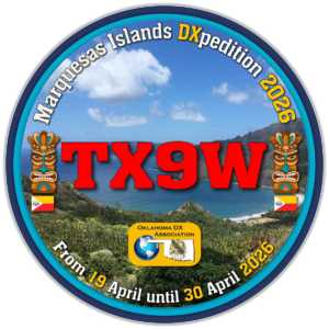 A team of 6 operators (K5WE, W5CCP, N5TEA, K4VBM, WD5COV, and F6BCW) will be active as TX9W from the village of Atuona on the island of Hiva Oa, Marquesas Islands beginning 19 April through 30 April, 2026.